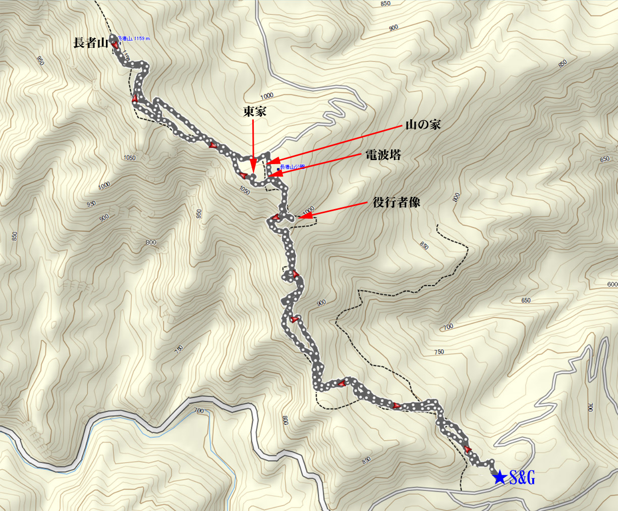 | 長者山ルート地図 (計曲線 50M 主曲線 10M) |