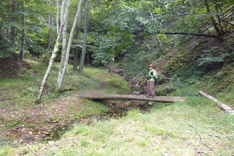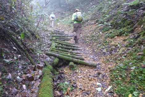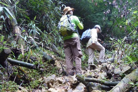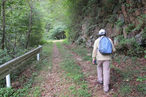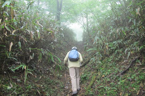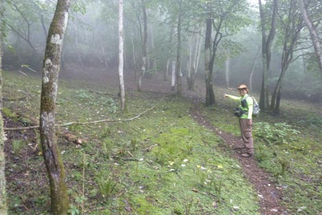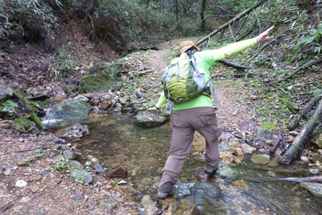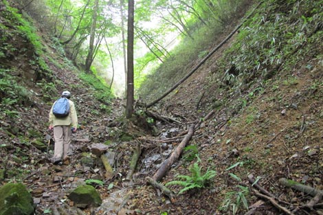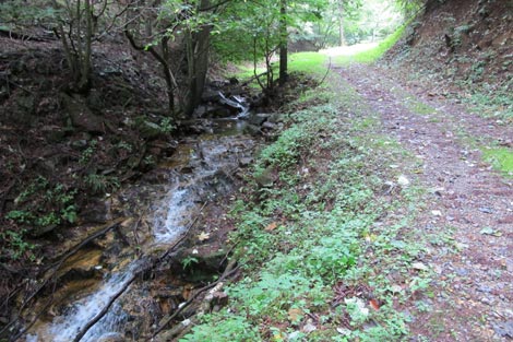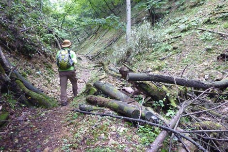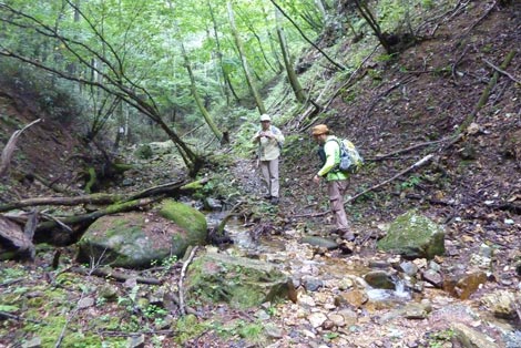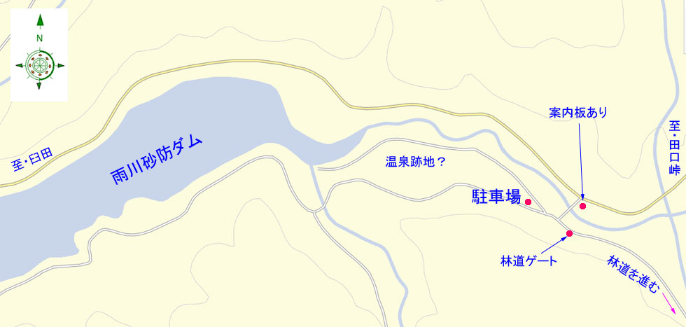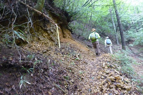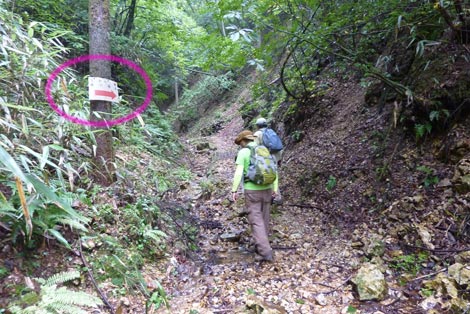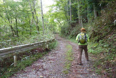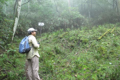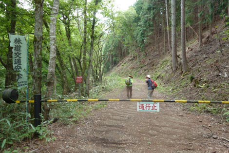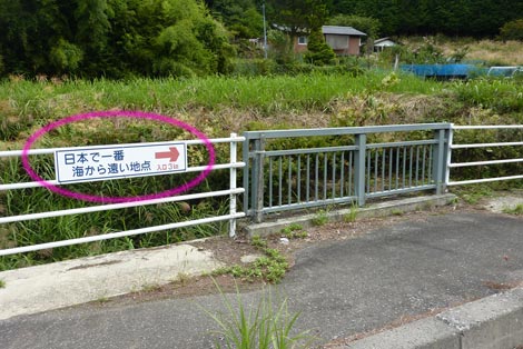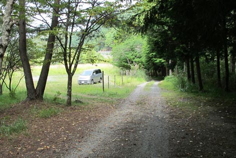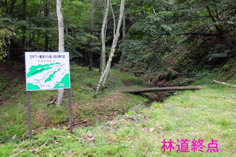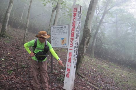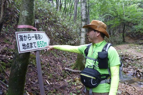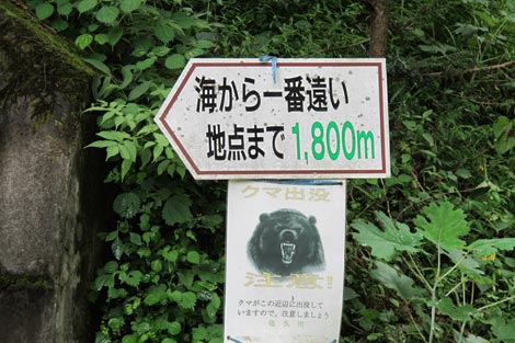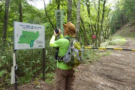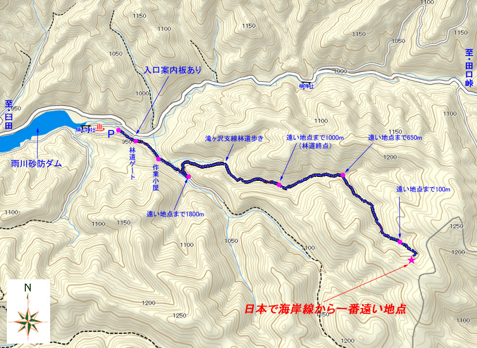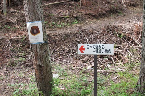 駐車場発 9:55 〜 林道ゲート 9:57 〜 作業小屋 10:02 〜 一番遠い地点まで.1800m 10:08 〜 林道終点・一番遠い地点まで.1000m 10:23 〜 一番遠い地点まで.650m 10:35 〜 一番遠い地点まで.100m 10:55 〜 日本で海岸線から一番遠い地点着 11:00-19