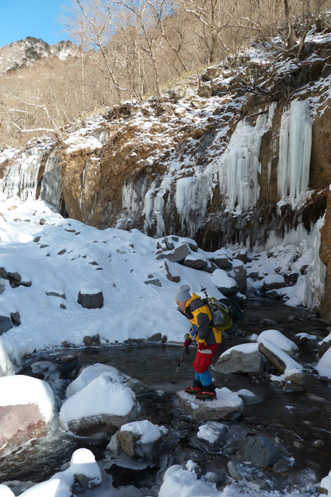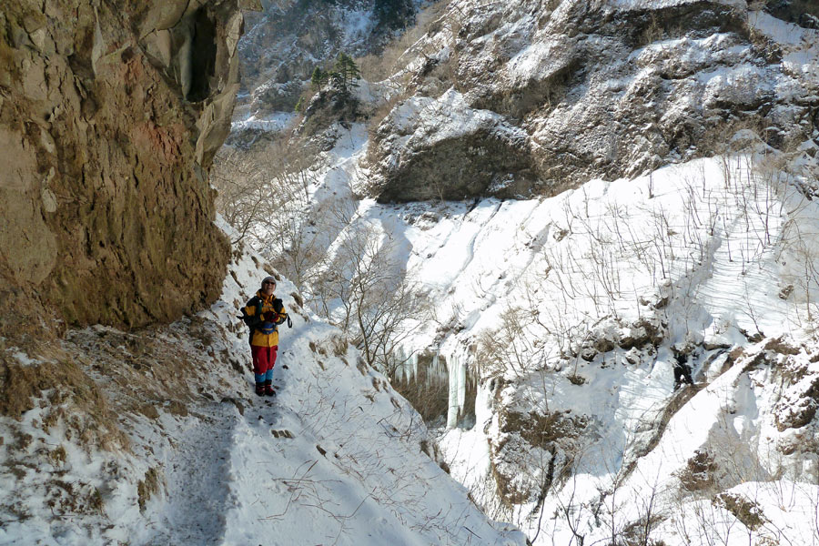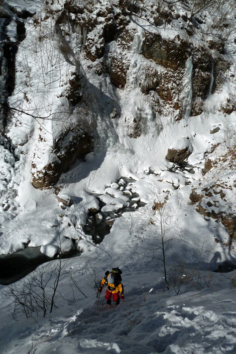氷の神殿を通過して雲龍瀑へ向かうが登るにつれ斜度がきつくなる難関斜面 |