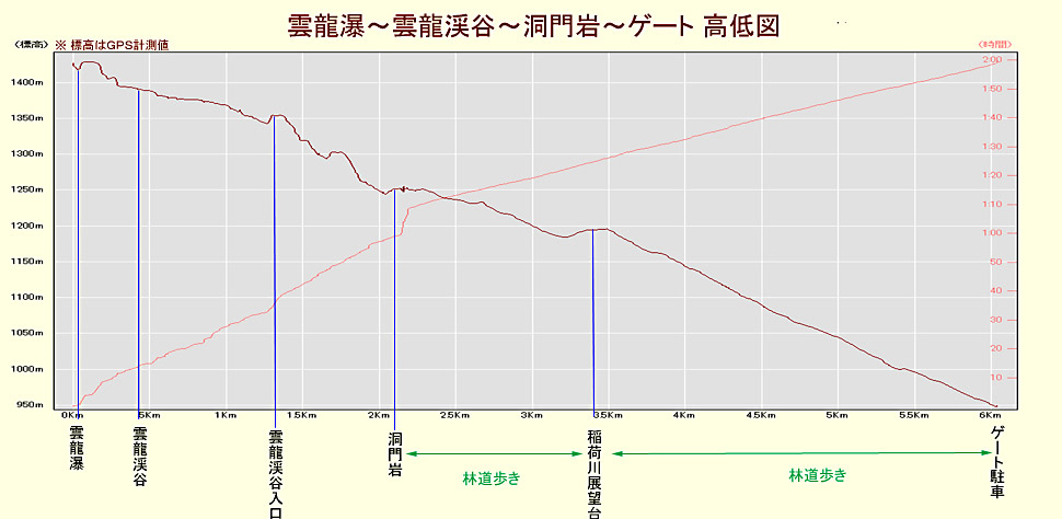 最終ゲートP標高 930M 雲龍瀑最高点 1490M 標高差 560M 総歩行距離 12385M |