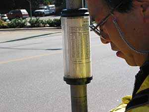 出るとポールに時刻表が付いている。 |