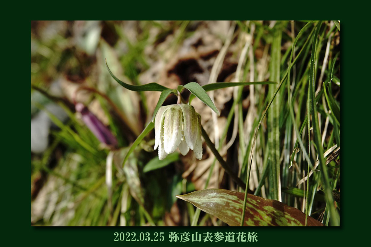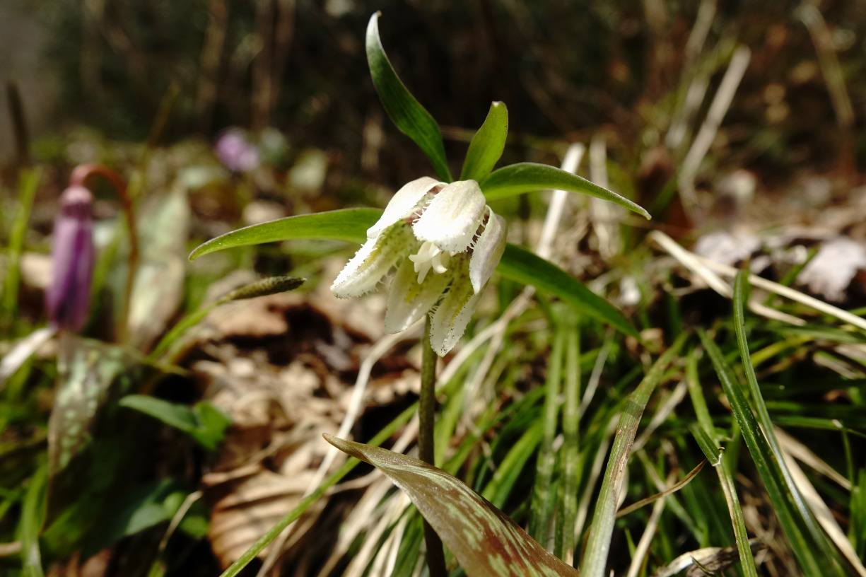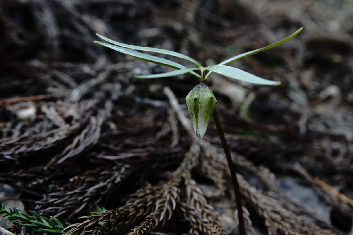 | コシノコバイモ 株はたくさん見つけるも、今年は寒さが続いたせいか開花していたのはこの一輪だけでした |