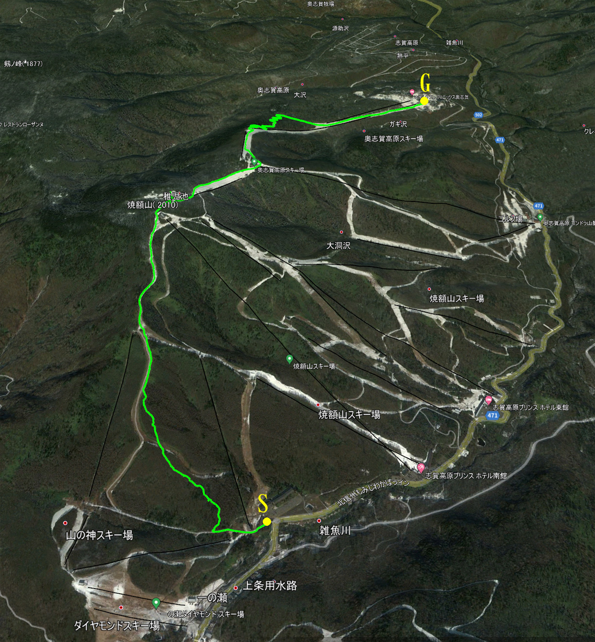 焼額山縦走ハイキング鳥瞰図