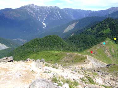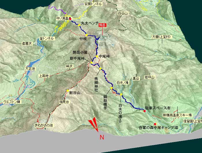 赤・中尾峠 青・展望台 黄・焼岳小屋 |