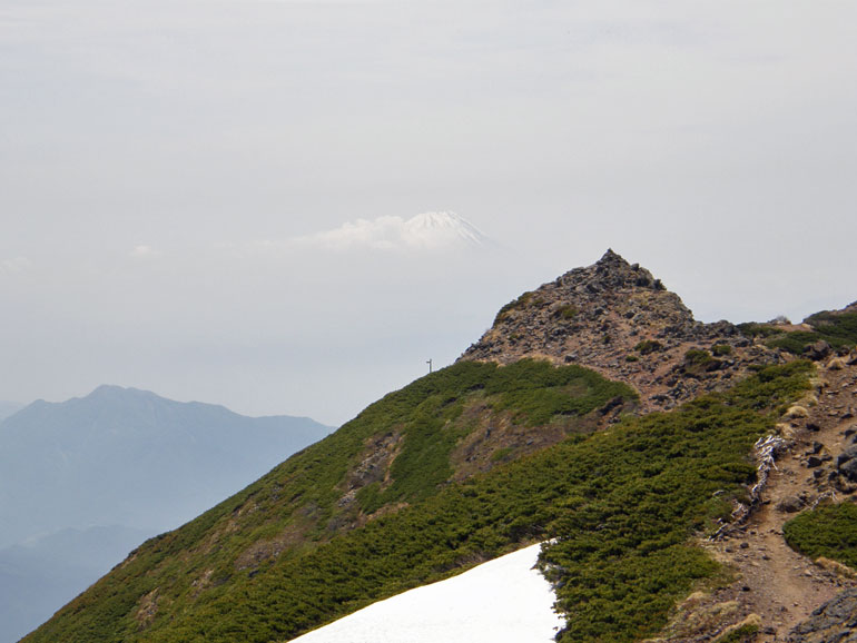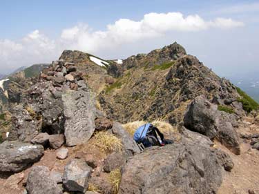 三叉峰直下のハイマツ帯から望む赤岳 |