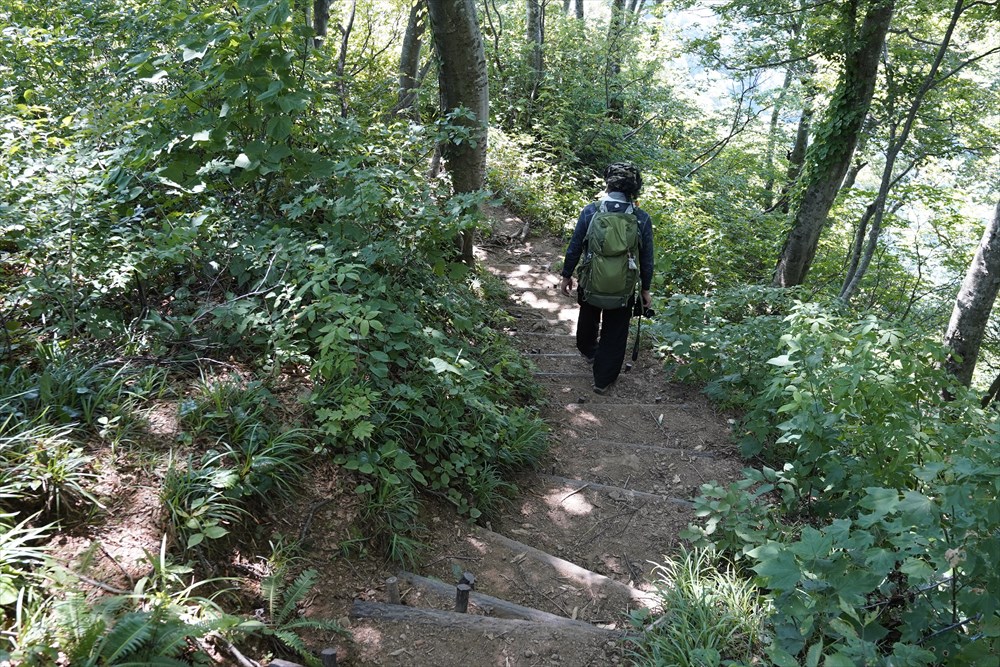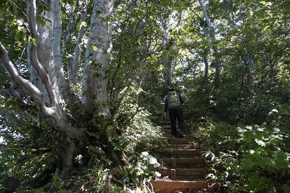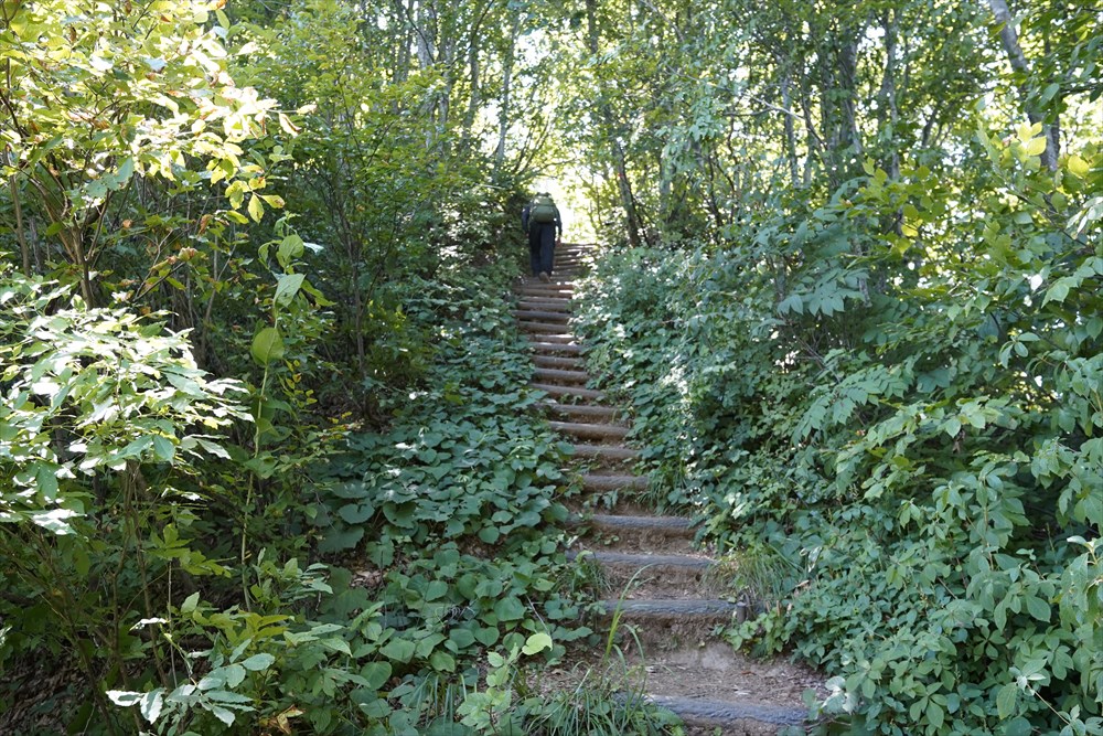 | 整備が行き届いた登山道 爺的には階段歩きは苦手だが、我々登山者が地肌を痛めるのを防ぐには階段整備がすべてかも・・・ |
