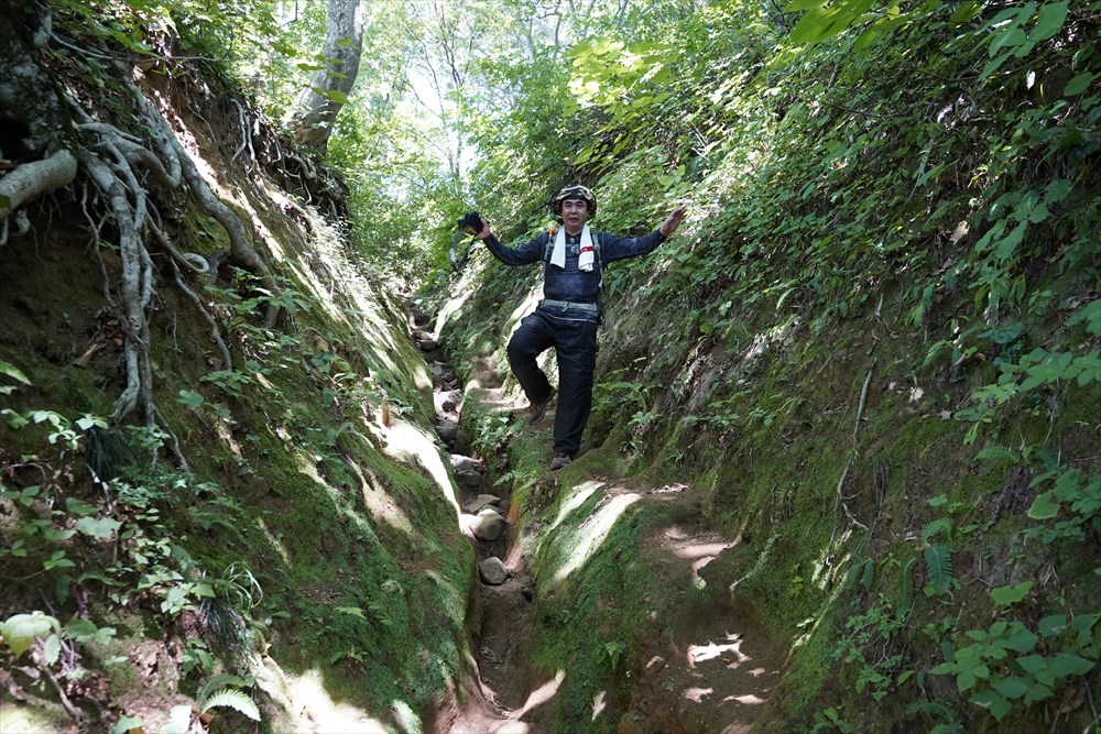 | 米山薬師参拝の表参道だったと思われる当ルートは参拝者(登山者)の踏み跡が年月を経て この様に深く抉れた(豪雨などで土砂流出も加わり)登山道になったものと思われる。 |