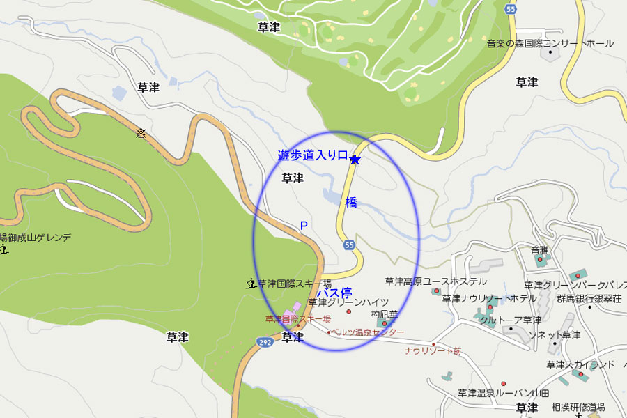 駐車場・バス停・白根 芳ヶ平方面遊歩道入口の拡大図 |