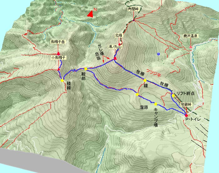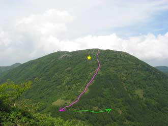 烏帽子岳稜線からの湯ノ丸山 ピンク・ガレ場の登山道 緑・キャンプ場への巻道 |