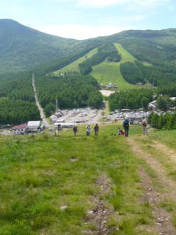 | 足慣らしにゲレンデを登る。 ツツジの時期はリフトが運行されているようだ |