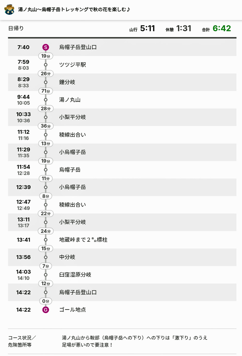 | 《湯ノ丸山-烏帽子岳コースタイム他》 写真撮影時間20分~100分含む |